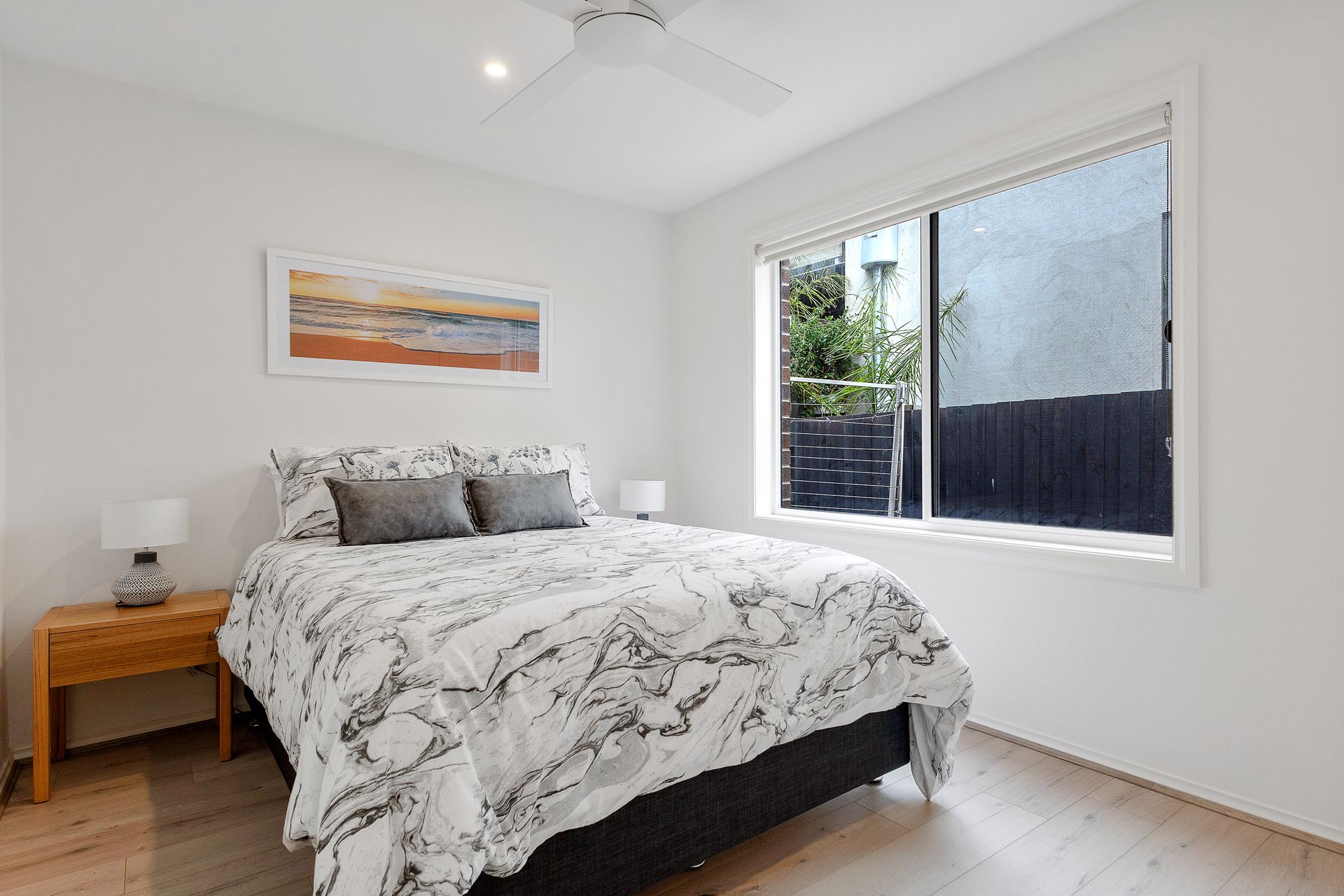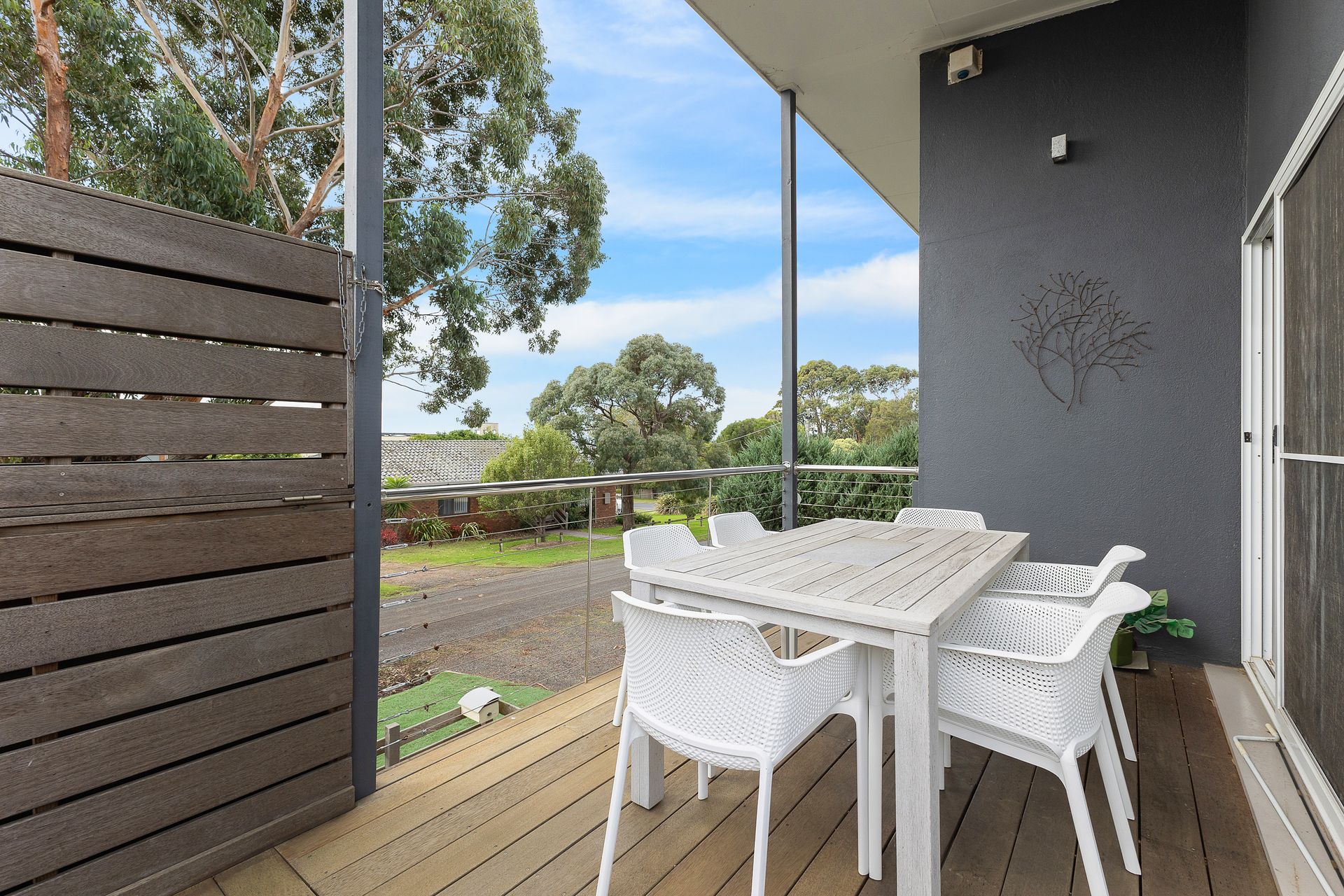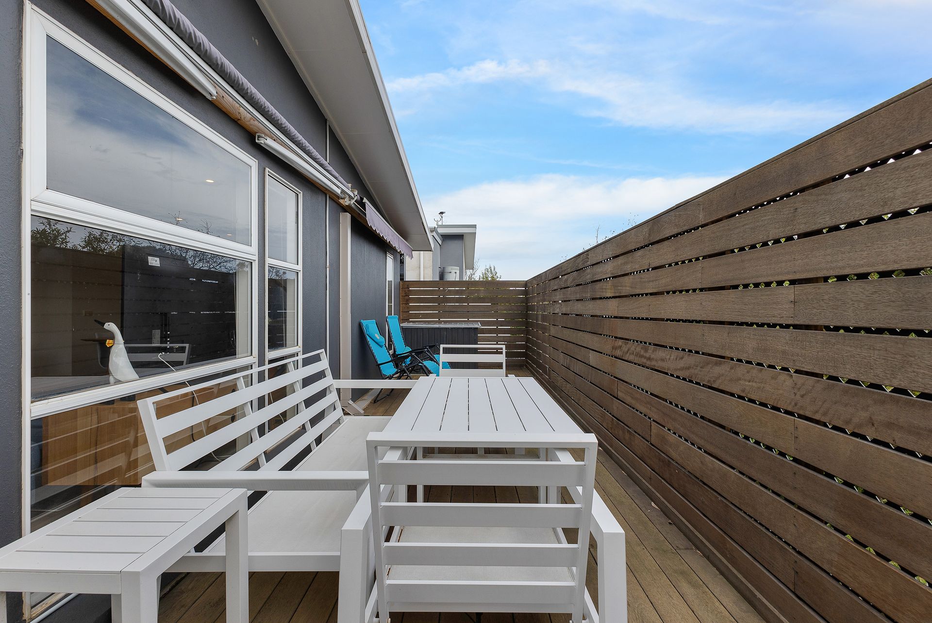 The large semi-covered first floor Deck (with Weber BBQ, Lounge area for 6 people & table/chairs for 6 people) also has 2 x awnings that can be extended to provide more cover. It wraps around the front and side of the home, overlooking the fully enclosed rear yard, which is perfect for children and small pets. The Garage is not available to guests, but there is space to park 1 vehicle (car &/or a boat - 10m x 2.3m) in the driveway, with additional parking available on the street.