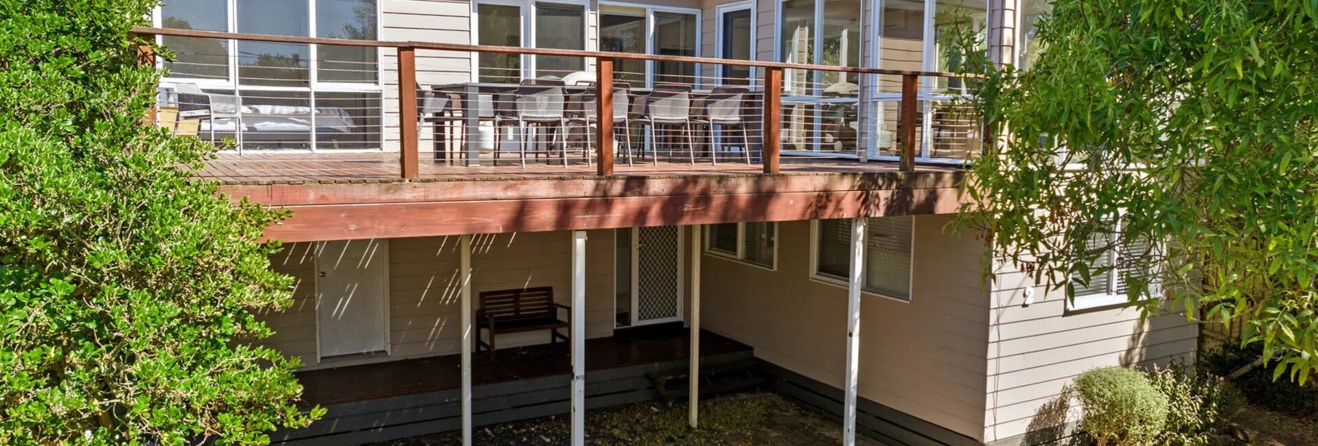 The large front upstairs Deck (with gas BBQ and a 10-seater table plus some spare chairs) has lovely views of the surrounding trees and overlooks the front yard. There is a small downstairs front Deck with seating for 2. The fully enclosed rear yard (with outdoor hot/cold shower and firepit - no firewood provided) is perfect for children and pets alike (pets to stay outside please). There is a double Carport with parking for 2 cars and space for an additional 4 vehicles (cars and/or boats) in the driveway.