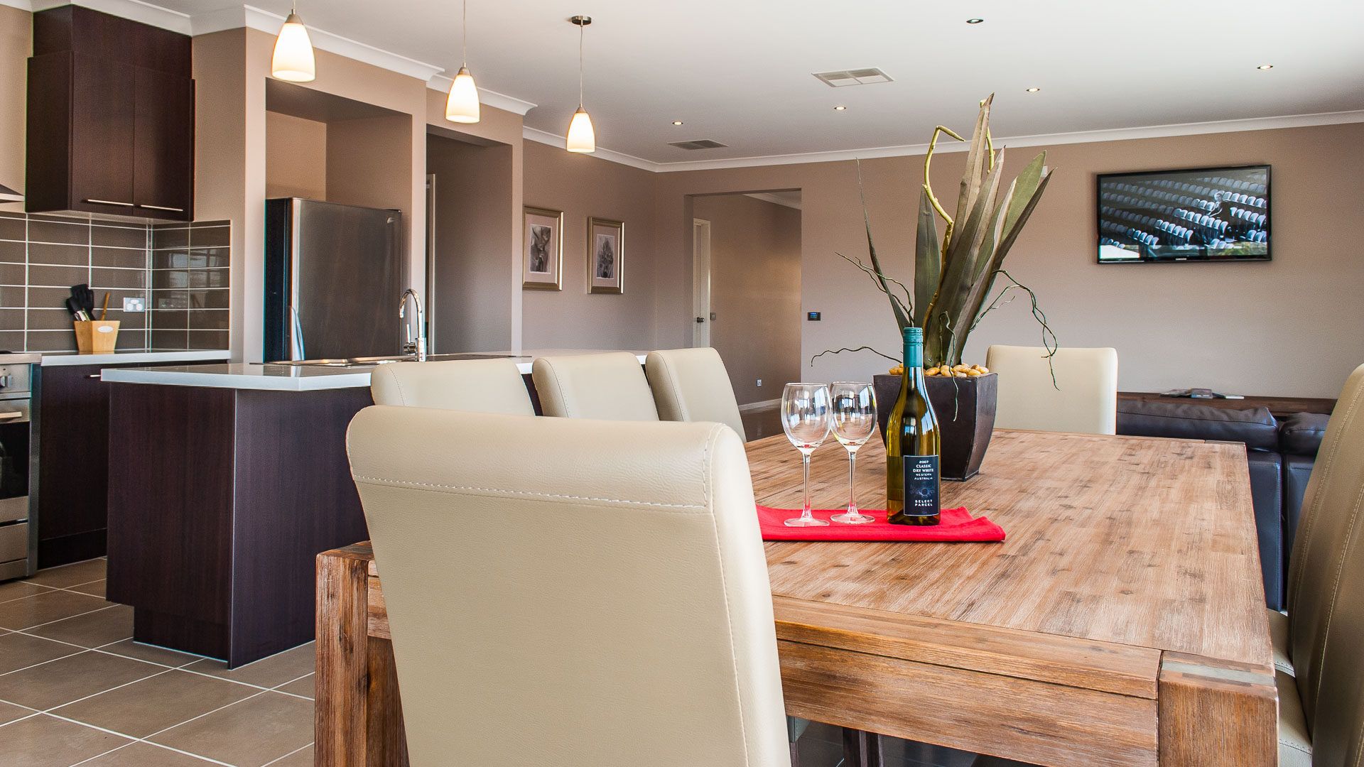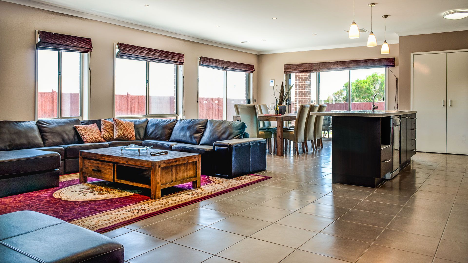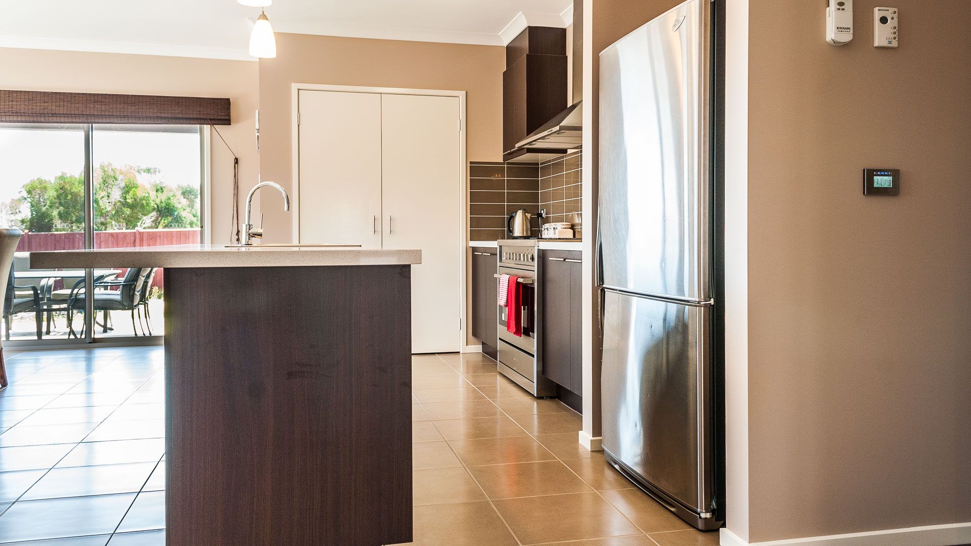This single-storey home has a large open-plan Kitchen/Dining/Living room (with TV, CD, DVD player and Stereo sound system), leading onto the shady outdoor deck area.